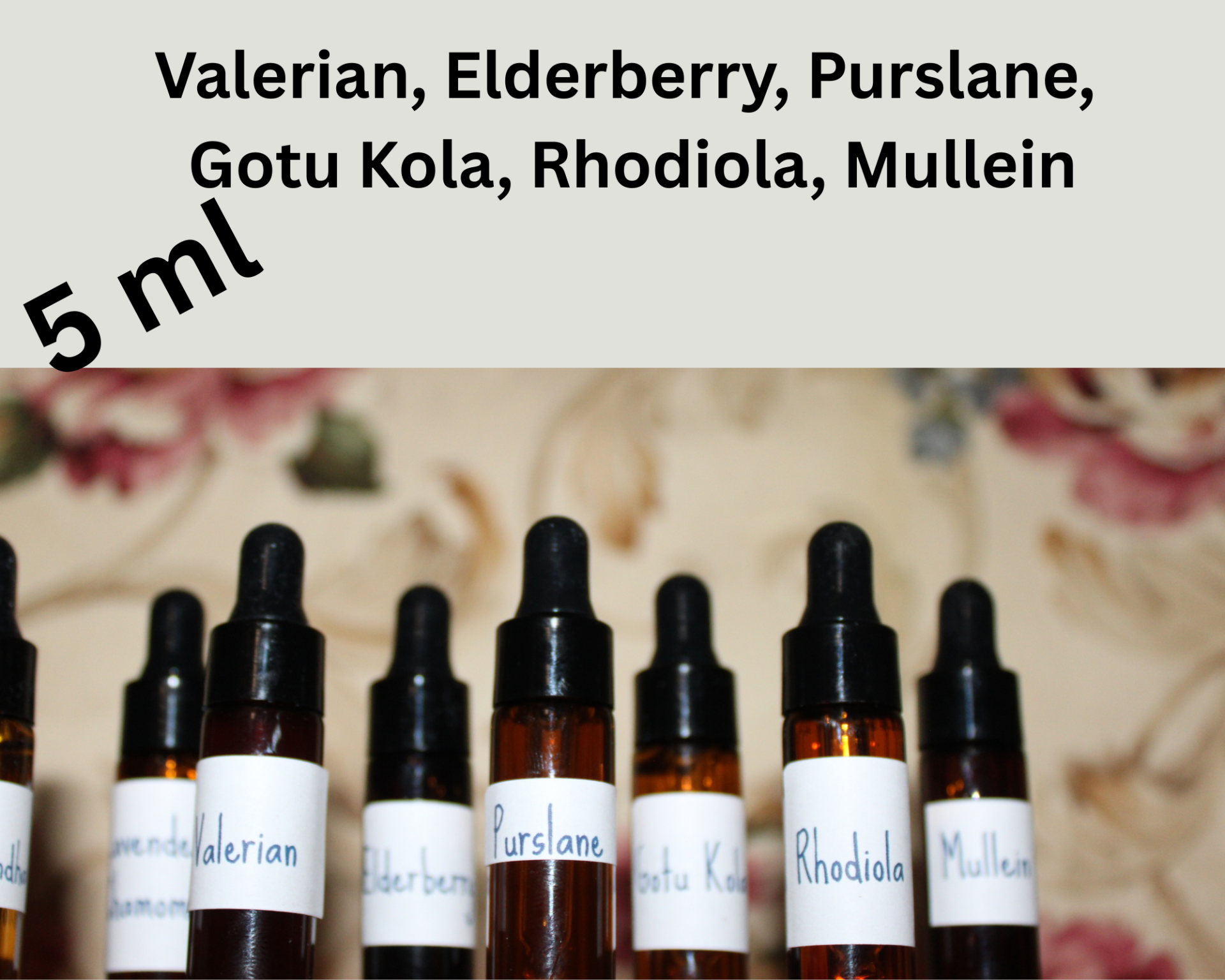 Herbal Tinctures in 5 mL dropper bottles all made with American Vodka and home-grown & harvested or sustainably selected herbs.